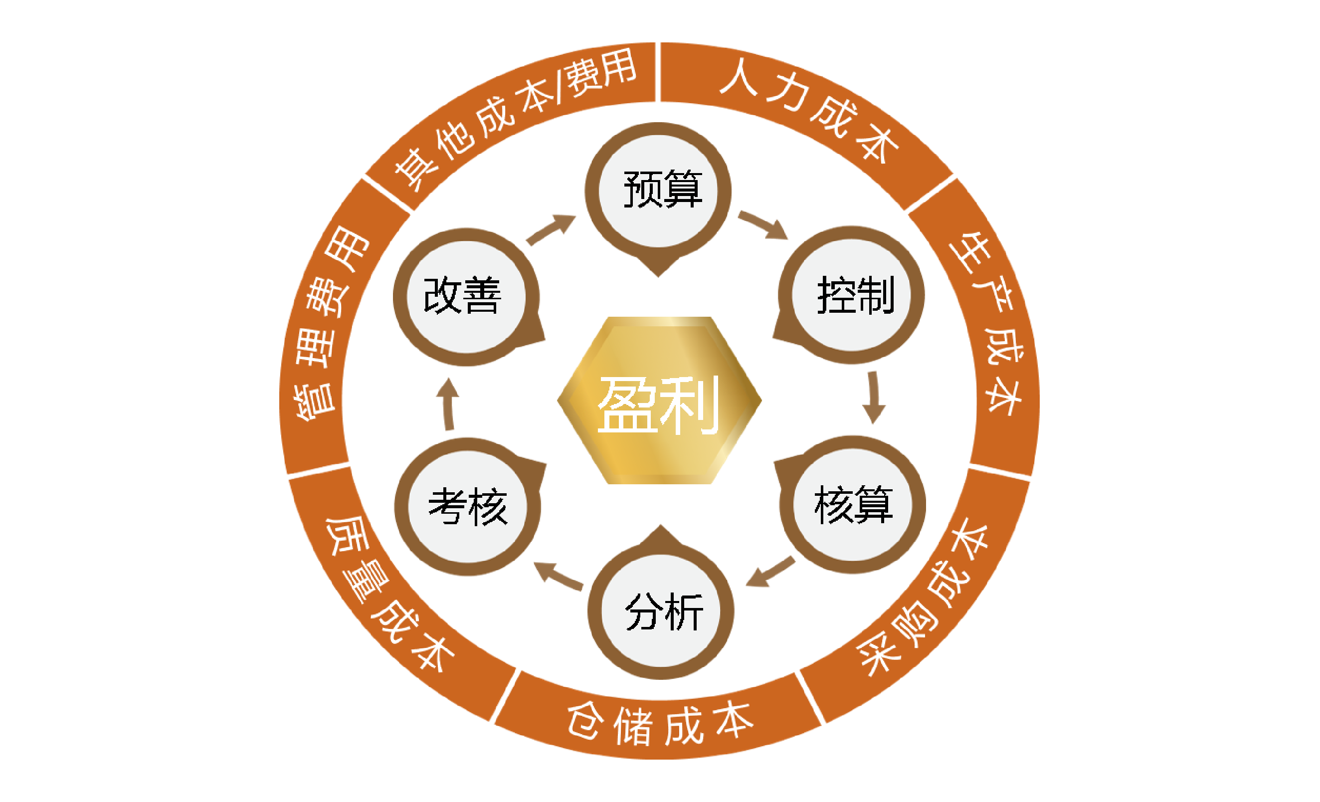 6. 改善:改善是根据分析和考核的结果,采取相应的措施,优化成本结构,降低成本。
