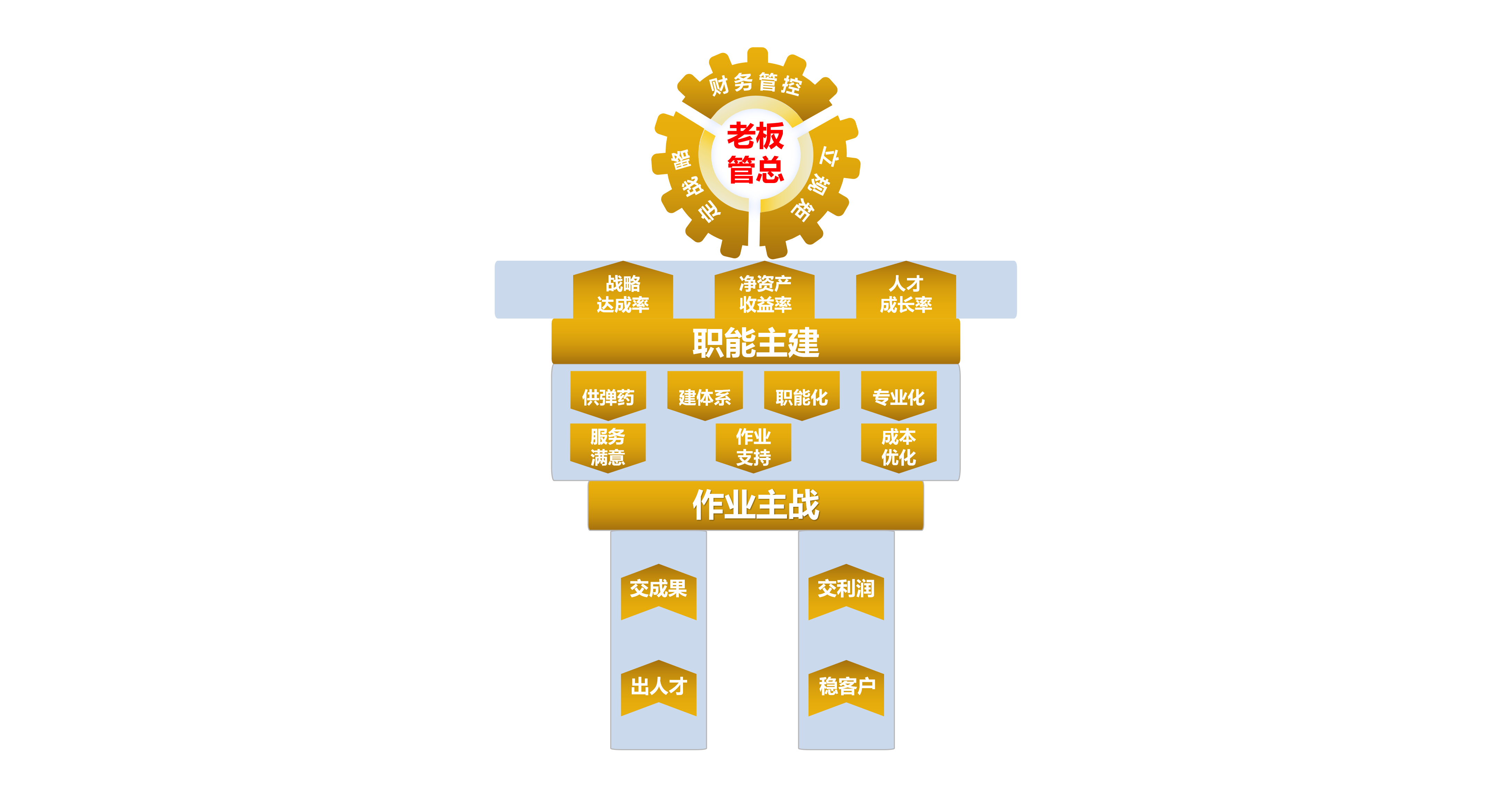 1. 老板管总:强调企业负责人和高层管理者对整个组织的财务管控、战略规划、产品规划、和风险管理。老板管总确保企业的方向和决策与整体战略保持一致。